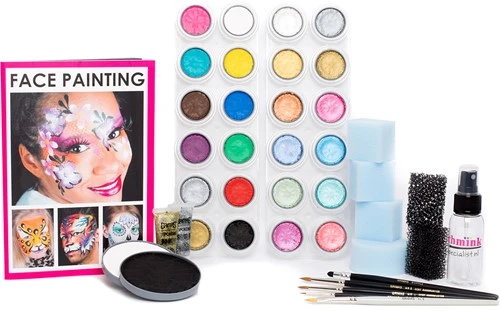 Dit Schmink pakket F bevat alles wat je nodig hebt als beginnend schminker. Met dit schminkpakket heb je een prima basis met 24 kleuren Grimas Water Make-up waarmee je kan schminken. Grimas Water Make-up is een ongeparfumeerde en glutenvrije watermake-up, bedoeld voor gezichts- en lichaamsbeschildering. De schmink kleuren van Grimas zijn onderling mengbaar. De schmink van Grimas mag op de slijmvliezen en rondom de ogen gebruikt worden en voldoet aan de Europese cosmetica wetgeving.