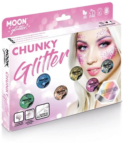 De chuncky glitters van Moon Creations zijn grove glitters van verschillende grootte door elkaar gemixt. De holografische festival glitters schitteren in het licht en voegen regenboog effecten toe aan elk geschminkt gezicht. Deze festival glitters worden veel gebruikt met carnaval, op festivals, voor een feestelijke make up maar ook voor bodypaint of in het haar is het effect super mooi.