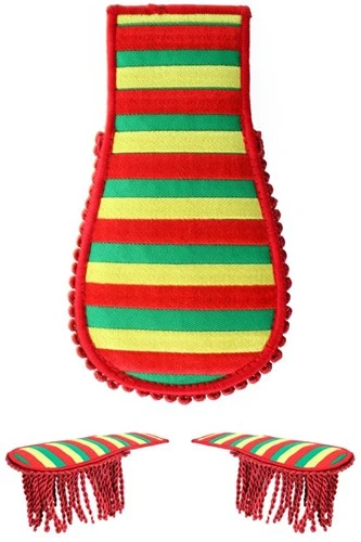 De schouderstukken zijn in de Limburgse carnavalskleuren rood geel en groen. De epaullettes zijn voorzien van klittenband welke je eenvoudig op je jas kan naaien.
