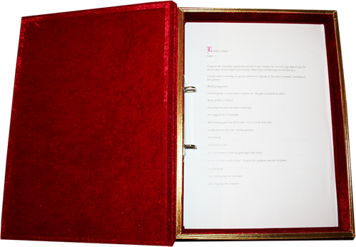 Een mooi boek van Sinterklaas uitgevoerd in velour rode stof met gouden bedrukking en gouden afwerking. Twee perforatie gaatjes in de verlanglijsjes en Sinterklaas kan op pad! Het grote boek van Sinterklaas heeft de afmetingen 25 x 33 x 4 cm.