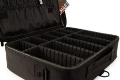 Het schminktas is voorzien van een deksel met een dubbele bodem waar u producten in kunt schuiven. De binnenzijde is voorzien van een verstelbaar vakkensysteem. U kunt de schminktas de volledig naar wens indelen. Op de achterzijde van de schminktas zit een band die u over het handvat van een trolley kunt plaatsen zodat u de tas en trolley tegelijk kunt vervoeren.