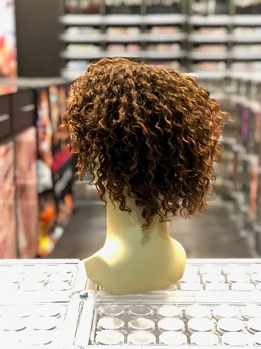 14. Als de pruik eenmaal droog is, breng de pruik weer in model door glansspray te sprayen.