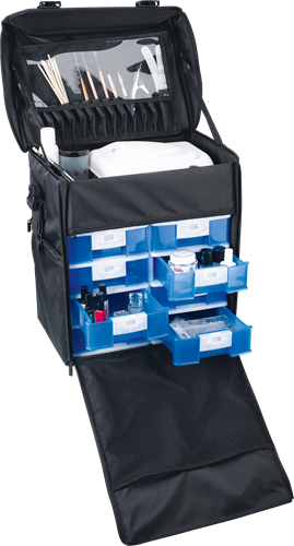 Aan de bovenzijde van deze tas zit een groot opbergvak, aan de voorzijde meerdere kleine opberglades. De lades kunt u desgewenst ook uit de tas halen. De Nail Artist tas wordt geleverd met schouderriem.