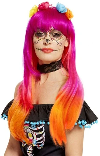 Deze deluxe Sugar Skull pruik in de kleuren roze en oranje wordt compleet met bloemen geleverd.