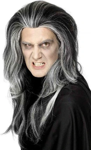 Deze mooie Gothic Vampieren Pruik heeft de basiskleur zwart en is gemêleerd met grijs, deze pruik past perfect bij een thema outfit voor bijvoorbeeld Halloween of Carnaval.