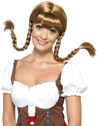 Deze Oktoberfeest Geigi Pruik is bruin en heeft twee gevlochten staartjes.