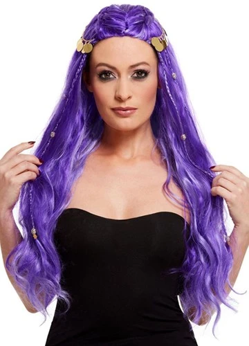 Deze paarze waarzegster pruik wordt compleet met munten en vlechtjes geleverd.