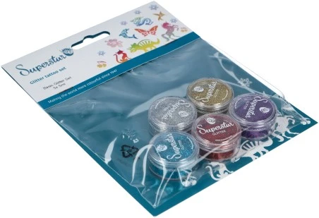 Deze Basic Glittertattoo Glitter Set van Superstar bestaat uit 5 kleuren glitters in potjes met een inhoud van 5 ml. De kleuren in deze glitter tattoo glitter set zijn: 111-100-160-122-142.