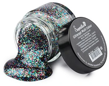 De Superstar Glittergel bevat polyester glitter (3 hex) van cosmetische kwaliteit in een gel basis. De gel is zo ontwikkeld dat je deze ook aan kan brengen op schmink zonder dat het deze oplost. Bovendien droogt de gel snel op. Voor een super glinsterend effect kan je een extra laag losse glitters aanbrengen wanneer de gel nog nat is.