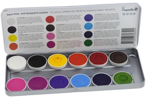 Superstar Schminkpallete Sparkling Faces by Svetlana Keller bevat 12 kleuren een zeer gebruiksvriendelijke waterschmink van hoge kwaliteit en voldoet aan alle strenge eisen van de Europese Cosmetica Wetgeving (1223/2009/EG).