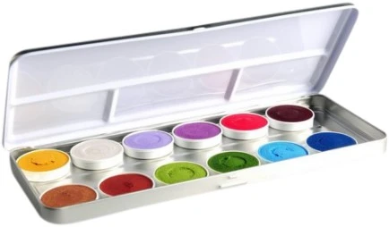 De matte kleuren zijn uitermate geschikt voor het schminken van de basis en het zetten van lijnen. De glanzende Shimmer kleuren schmink zijn wat zachter en daarom zeer geschikt voor het schminken van de basis van je creaties. Omdat de shimmer kleuren wat zachter zijn, heb je weinig water nodig om de schmink te activeren.