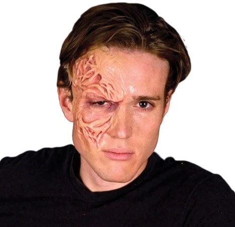 Bepaal eerst waar je de Prothese wilt plaatsen. Houd de prothese tegen de huid en dep met een sponsje met transparant poeder over de randen. Op deze manier krijg je een goed beeld waar je de prothese moet plakken. Vervolgens breng je een dunne laag huidlijm of mastix extra aan op de huid en op de achterkant van de prothese. Gebruik niet te veel en wees extra voorzichtig rond de ogen en mond. Laat de lijm een beetje drogen voordat je de prothese op de juiste plek aanbrengt.